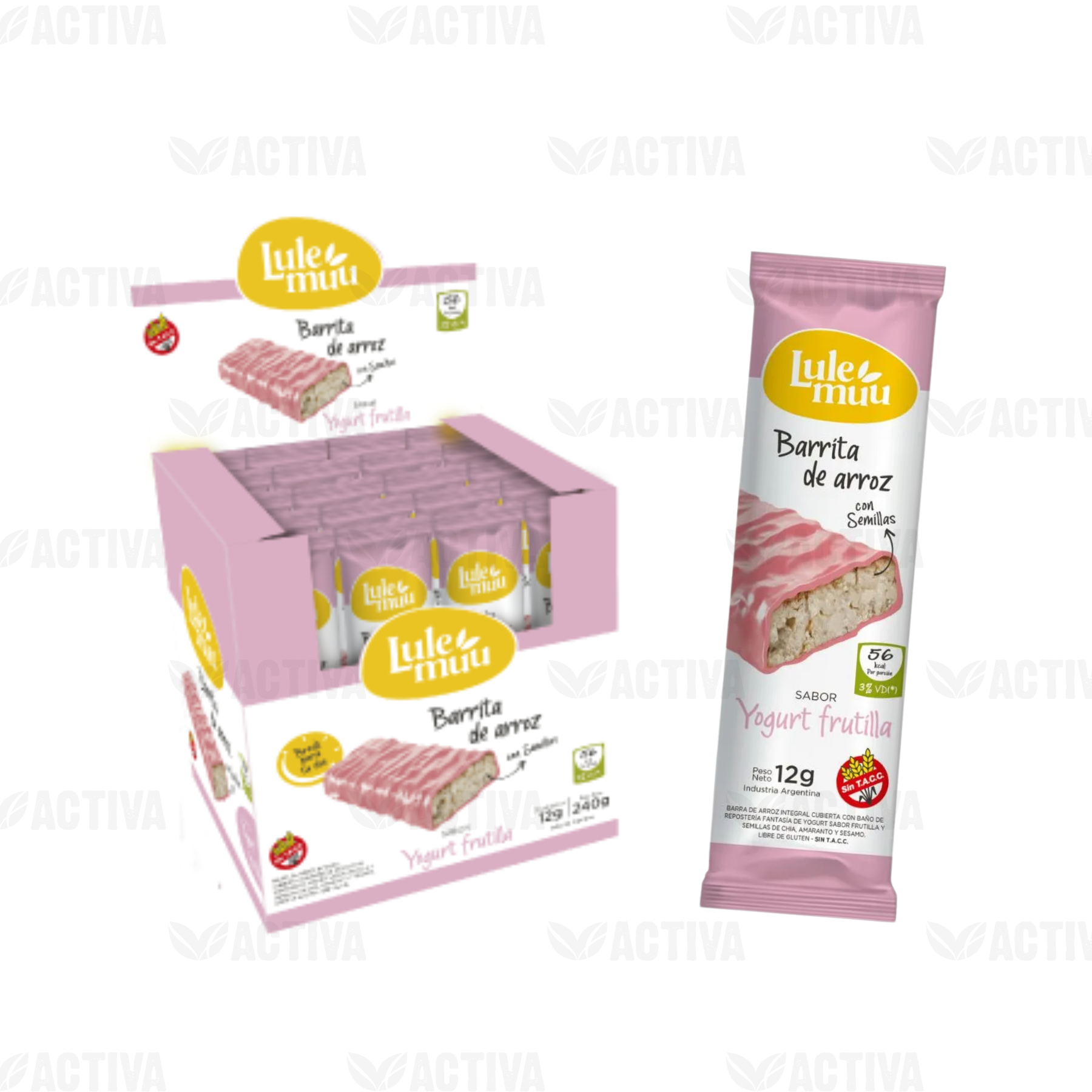 BARRA arroz bañada C/YOGURT FRUTILLA Display x 20 UN -Lulemuu-